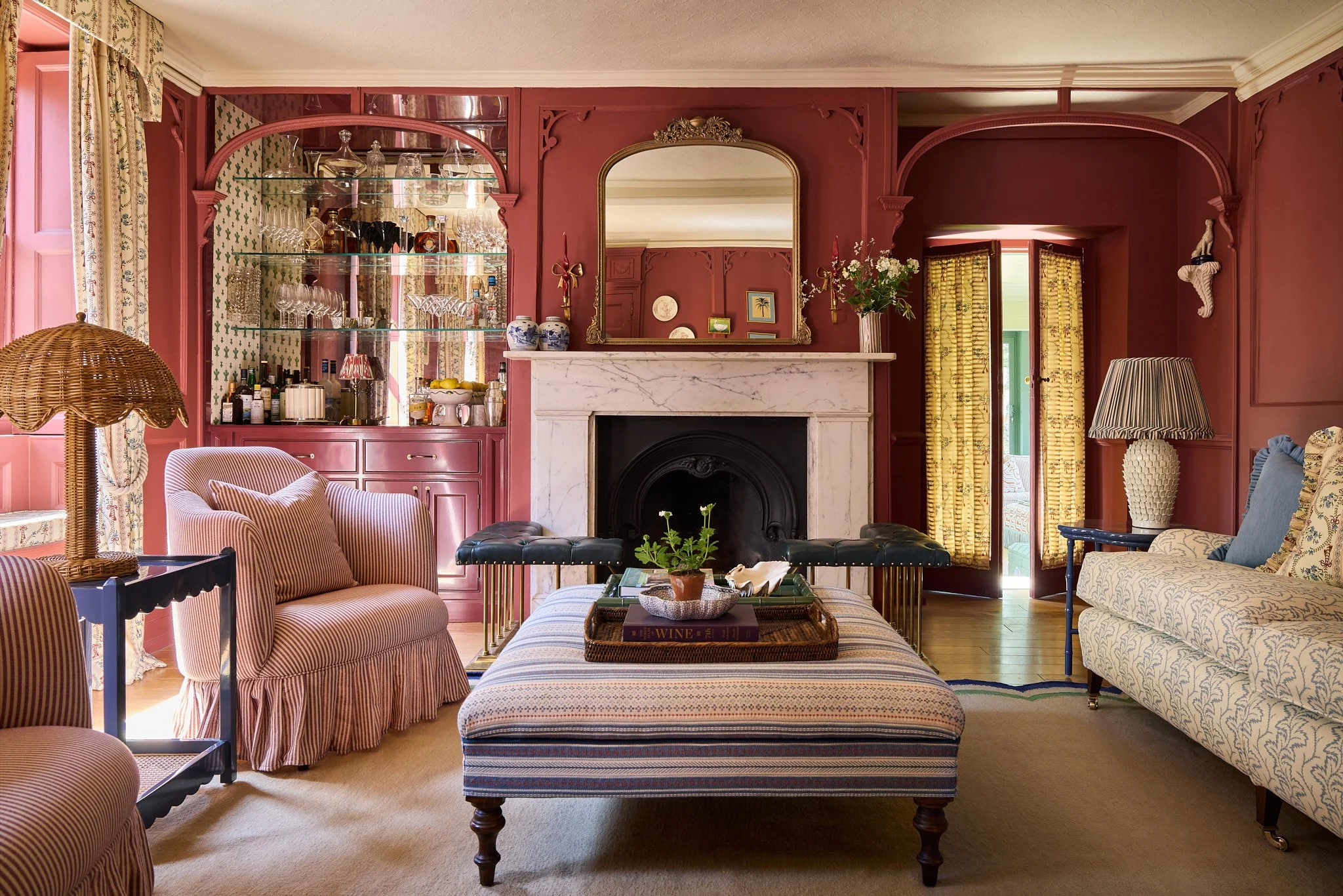 We recently had the pleasure of transforming a young family's drawing room and conservatory into vibrant spaces perfect for entertaining. Understanding their passion for hosting, we crafted a design that is both fun and warm, while complementing the grandeur of their home. Our layered scheme, rich in color and pattern, creates inviting spaces that are both fun and glorious. The highlight of the project is a bespoke glossy bar, serving as the focal point of the drawing room.